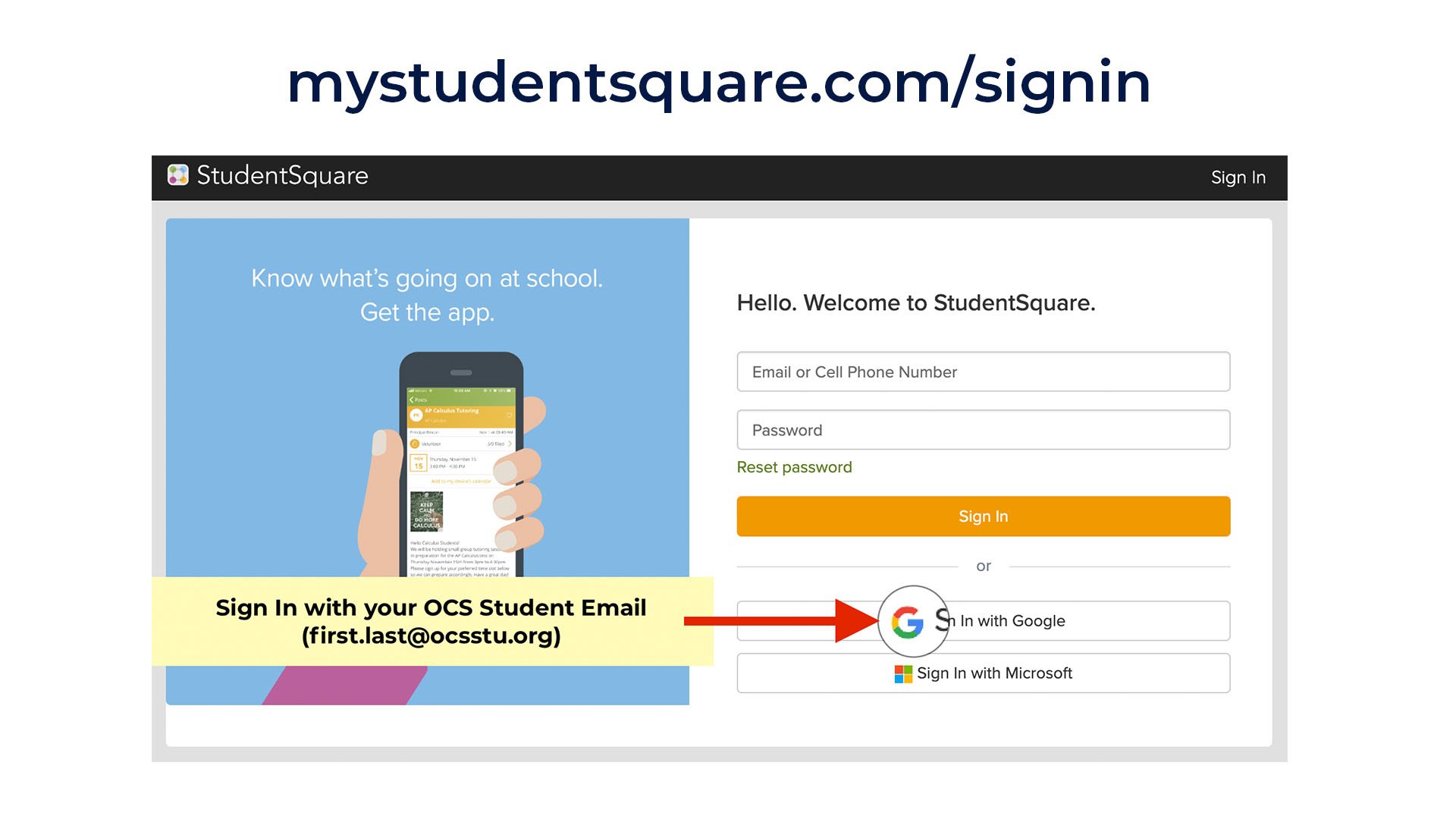 NOTE: Click “Sign In with Google” and use your OCS student email (ocsstu.org) and the password associated with that account.